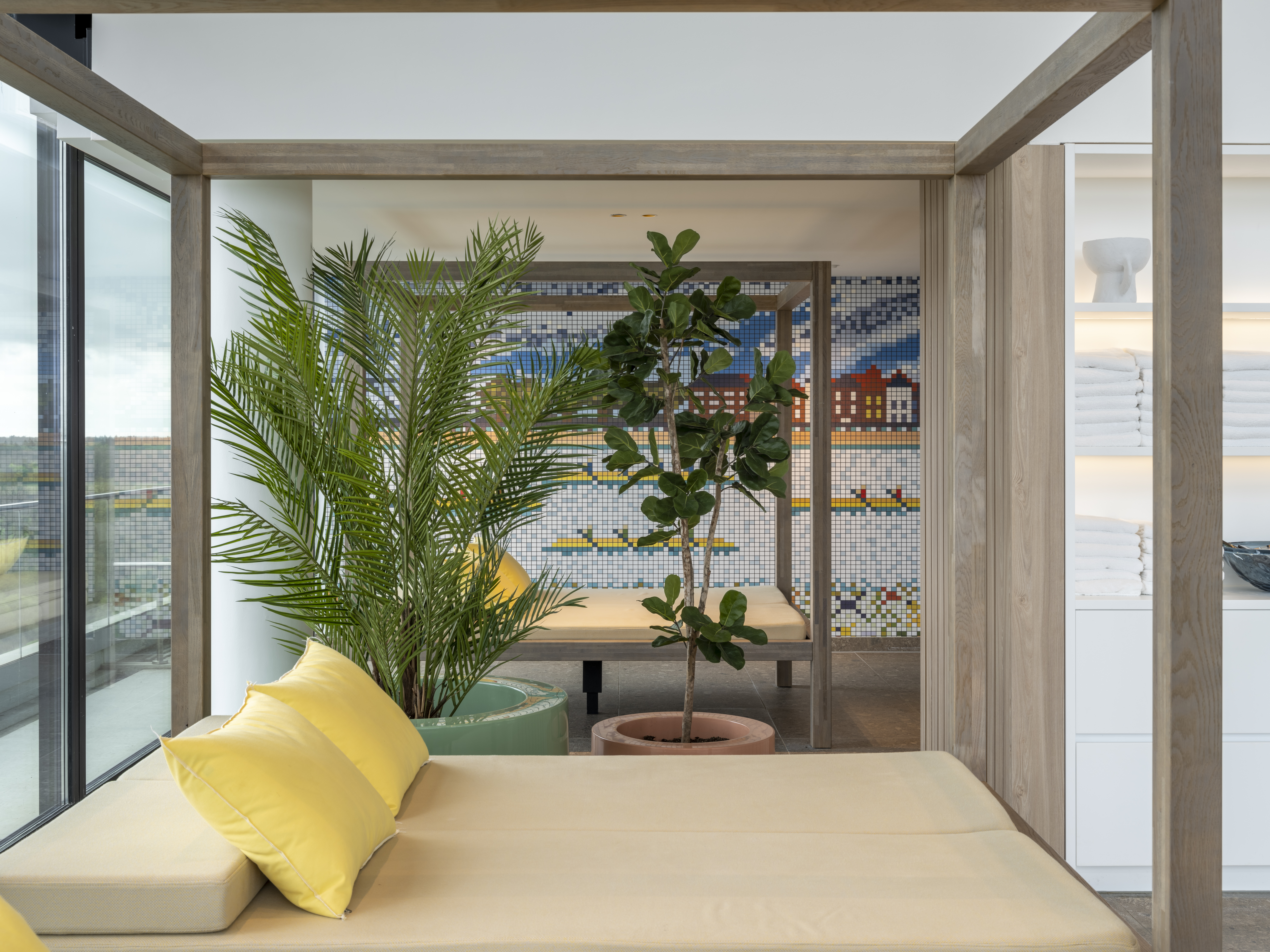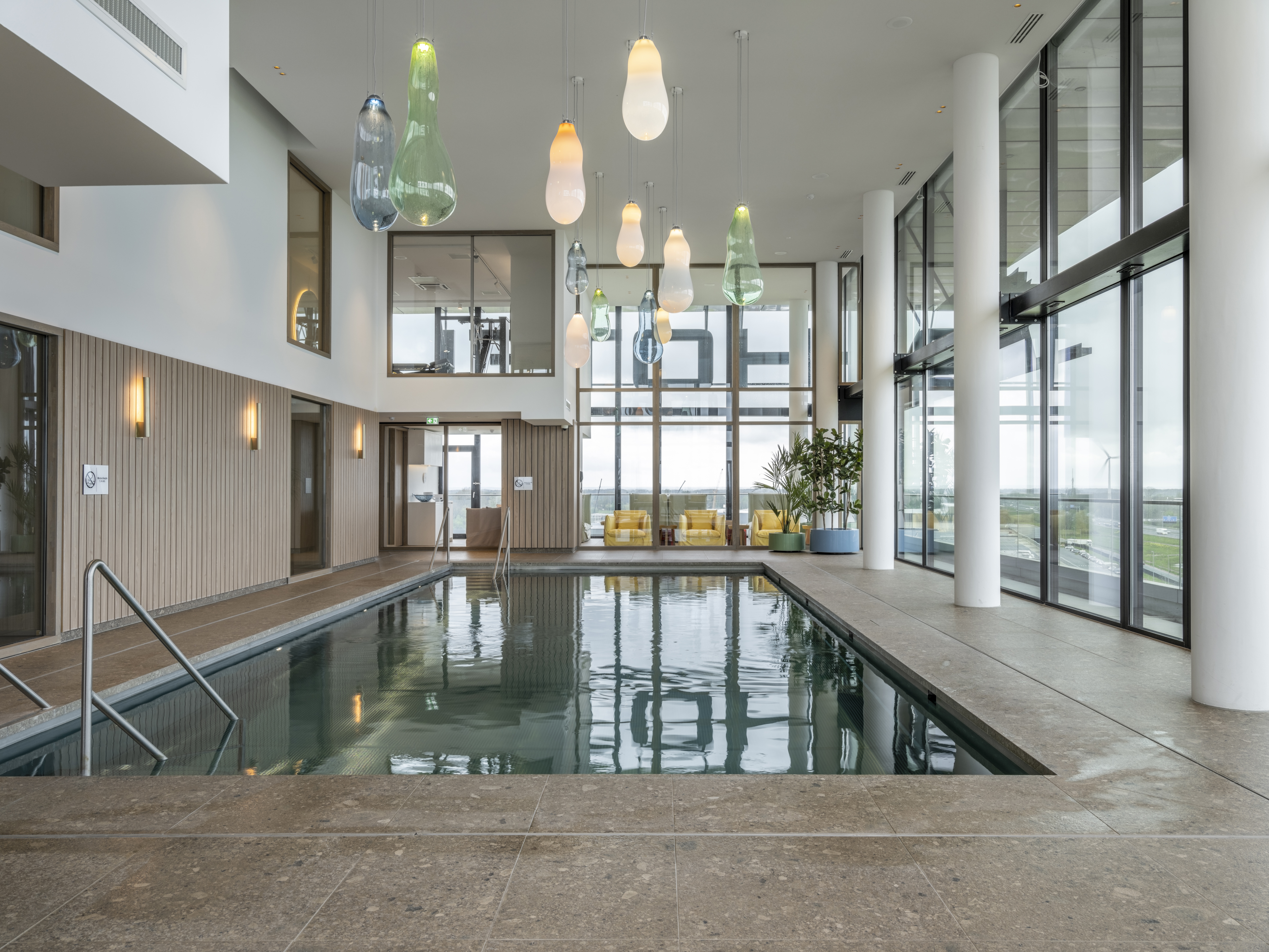Het verwarmde binnenzwembad biedt een ideale plek om helemaal tot rust te komen, ongeacht het weer buiten. Trek een paar baantjes om de dag energiek te starten of geniet op de ligbedden van het prachtige uitzicht over de omgeving
